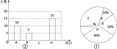 我市某中学决定在八年级阳光体育“大课间”活动中开设A:实心球,B:立定跳远,C:跳绳,D:跑步四种活动项目.为了了解学生对四种项目的喜欢情况,随机抽取了部分学生进行调查,并将调查结果绘制成如图①②的统计图.请结合图中的信息解答下列问题: