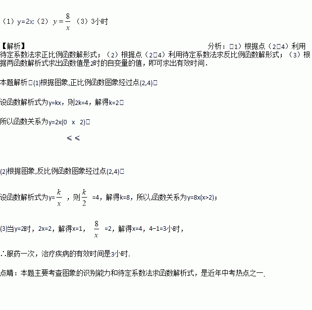 病人按规定的剂量服用某种药物,测得服药后2小时,每毫升血液中的含药量达到最大值为4毫克,已知服药后,2小时前每毫升血液中的含药量y(毫克)与时间x(小时)成正比例,2小时后y与x成反比例(如图所示).根据以上信息解答下列问题.