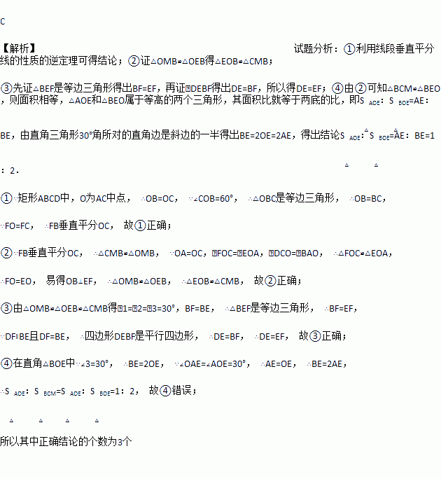 .如图,矩形ABCD中,O为AC中点,过点O的直线分别与AB、CD交于点E、F,连结BF交AC于点M,连结DE、BO.若∠COB=60°,FO=FC,则下列结论:①FB垂直平分OC;②△EOB≌△CMB;③DE=EF;④S△AOE:S△BCM=2:3.其中正确结论的个数是( )
