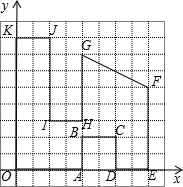 解答 解:刘湘利用了坐标确定点的位置,如图,图形的形状是OABCDEFGHIJK,各点的坐标是O(0,0),A(4,0),B(4,2),C(6,2),D(6,0),E(8,0),F(8,5),G(4,7),H(4,3),I(2,3),J(2,8),K(0,8).