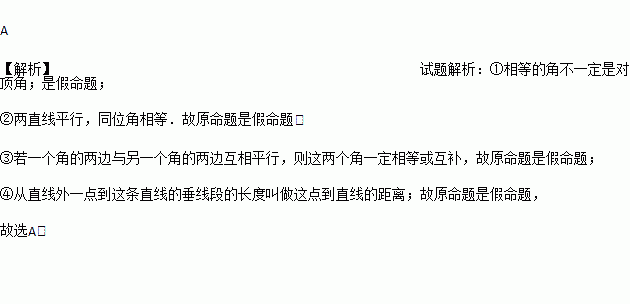 有下列四个命题:①相等的角是对顶角;②同位角相等;③若一个角的两边与另一个角的两边互相平行,则这两个角一定相等;④从直线外一点到这条直线的垂线段,叫做点到直线的距离。其中是真命题的个数有( )