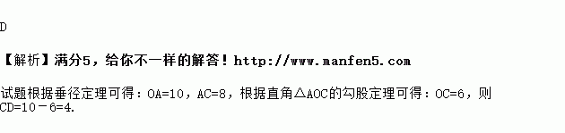 一条排水管的截面如图所示,已知该排水管的半径OA=10,水面宽AB=16,则排水管内水的最大深度CD的长为 ( )