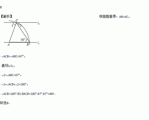 如图,直线l1∥l2,以直线l1上的点A为圆心、适当长为半径画弧,分别交直线l1、l2于点B、C,连接AC、BC.若∠ABC=67°,则∠1=( )