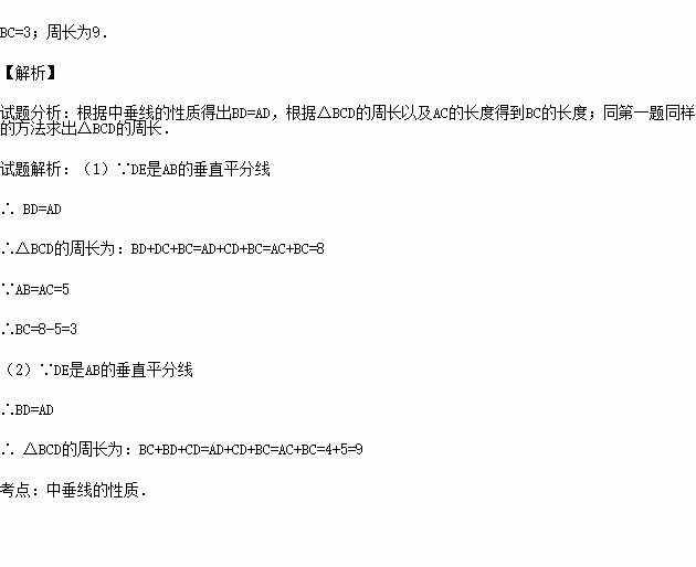 如图:△ABC中,AB=AC=5,AB的垂直平分线DE交AB、AC于E、D,