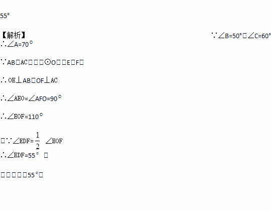 如图,⊙O 内切于△ABC,切点 D,E,F 分别在 BC,AB,AC 上.已知∠B=50°,∠C=60°,连结 OE,OF,DE,DF,那么∠EDF 等于__________.