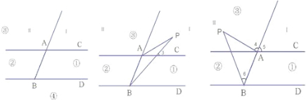 ①若点P位于第Ⅰ部分(如中图),则∠PBD=∠3,∠PAC+∠APB=∠3,