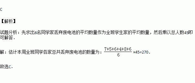 为了让人们感受丢弃废旧电池对环境造成的影响,某班环保小组的6名同学记录了自己家中一个月内丢弃废电池的数量,结果如下(单位:个):7,5,6,4,8,6,如果该班有45名学生,那么根据提供的数据估计该月全班同学各家总共丢弃废旧电池的数量约为( )