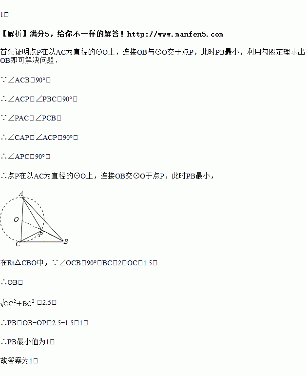 如图,在Rt△ABC中,∠ACB=90°,AC=3,BC=2.点P是△ABC内部的一个动点,且满足∠PAC=∠PCB,则线段BP长的最小值是_____.
