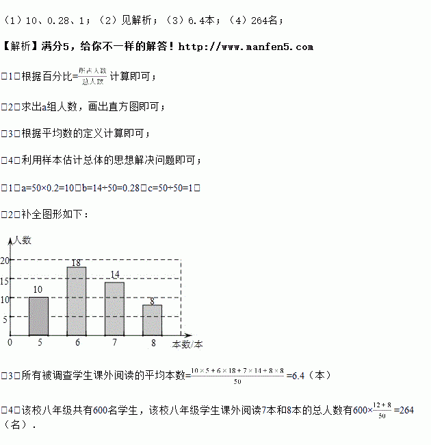 (4)若该校八年级共有600名学生,你认为根据以上调查结果可以估算分析该校八年级学生课外阅读量为7本和8本的总人数为多少吗?请写出你的计算过程.