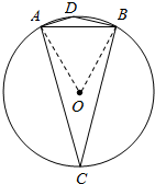 分析:连接OA、OB,根据等边三角形的性质,求出∠AOB的度数,再根据圆周定理求出∠C的度数,再根据圆内接四边形的性质求出∠D的度数.