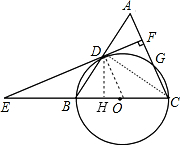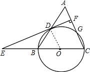 分析:(1)连结OD,如图,通过证明OD∥AC,加上DF⊥AC,于是可得到DF⊥OD,然后根据切线的判定定理可得DF为⊙O的切线;,