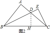 (2)如图2,过D作DH⊥BC于H,根据等腰直角三角形的性质得到∠ACB=45°,求得∠HDC=45°=∠ACB,根据等腰三角形的性质得到DH=CH,根据角平分线的性质得到AD=DH,证得Rt△ABD≌Rt△BDH,于是得到AB=BH,即可得到结论.