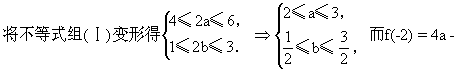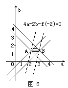建立直角坐标系aob,作出不等式组(Ⅰ)所表示的区域,如图6中的阴影部分.因为f(-2)=4a-2b,所以4a-2b-f(-2)=0表示斜率为2的直线系.如图6,当直线4a-2b-f(-2)=0过点A(2,1),B(3,1)时,分别取得f(-2)的最小值6,最大值10.即f(-2)的取值范围是:6≤f(-2)≤10.