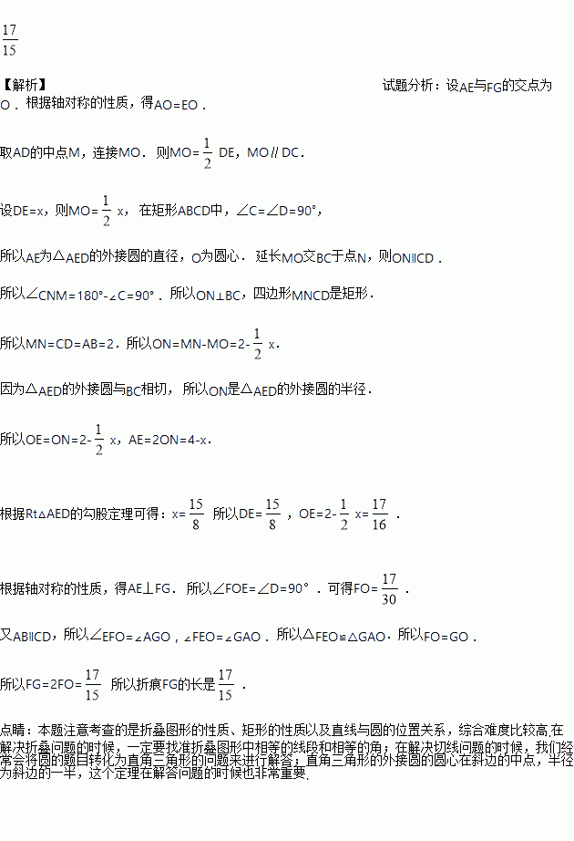 如图,矩形纸片ABCD中,AD=1,AB=2.将纸片折叠,使顶点A与边CD上的点E重合,折痕FG分别与AB、CD交于点G、F,AE与FG交于点O.当△AED的外接圆与BC相切于BC的中点N.则折痕FG的长为______.