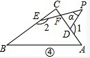 (4)若点P运动到△ABC形外(只需研究图④情形),则∠α、∠1、∠2之间有何关系?并说明理由.