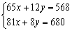 某公园有东、西两个门,开园半小时内东门售出成人票65张,儿童票12张,款568元,西门售出成人票81张,儿童票8张,收票款680元。问此公园成人票、儿童票每张售价各几元?