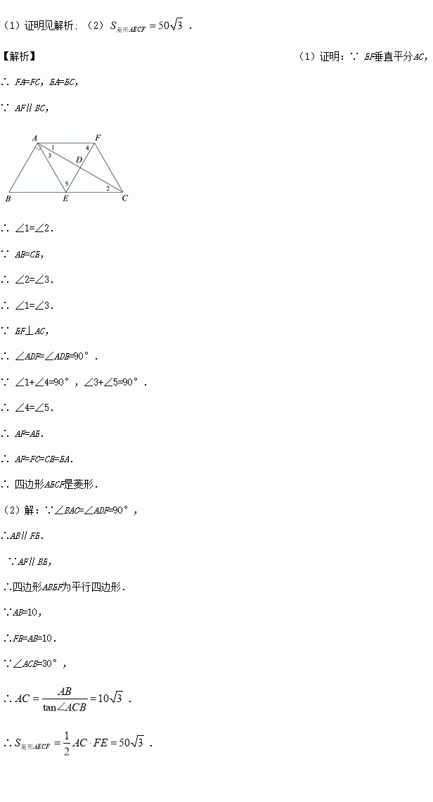 (2)若AB=10,∠ACB=30°,求菱形AECF的面积.