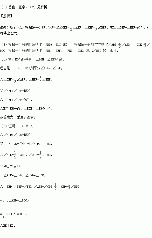 (2)如图2,已知:AB∥CD∥EF,BE、DE分别平分∠ABD、∠BDC,求证:BE⊥ED.
