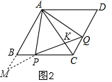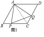 ·ÖÎö £¨1£©Èçͼ1£¬Á¬½ÓAC£¬¸ù¾ÝÁâÐεÄÐÔÖÊÖ¤Ã÷¡÷ABCºÍ¡÷ACDÊǵȱßÈý½ÇÐΣ¬µÃ¡ÏB=¡ÏACQ£¬AB=AC£¬¸ù¾ÝÁ½¶¯µãÔ˶¯µÄËÙ¶ÈÏàµÈ¿ÉÖª£ºBP=CQ=t£¬Ö¤Ã÷¡÷ABP¡Õ¡÷ACQ£¬µÃAP=AQ¼°¡ÏPAQ=60¡ã£¬ËùÒÔ¡÷APQΪµÈ±ßÈý½ÇÐΣ»