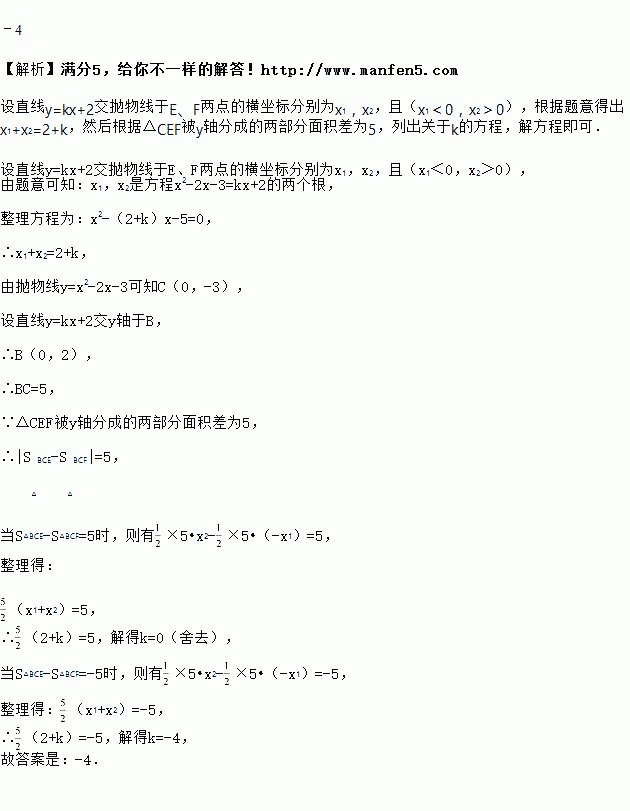 抛物线y=x2﹣2x﹣3与交y轴负半轴于C点,直线y=kx+2交抛物线于E、F两点(E点在F点左边).使△CEF被y轴分成的两部分面积差为5,则k的值为_____.
