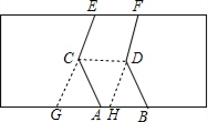 解答 解:如图,由图知CD∥AB,延长EC和FD,即得所求新渠.这时,HG=AB(都等于CD),且CD∥AB,∴四边形CGHD为平行四边形,四边形CABD为平行四边形,∴平行四边形CGHD和平行四边形CABD的高相等,∴平行四边形CGHD和平行四边形CABD的面积相等,∴道路所占面积不变,∴草地的种植面积不变.