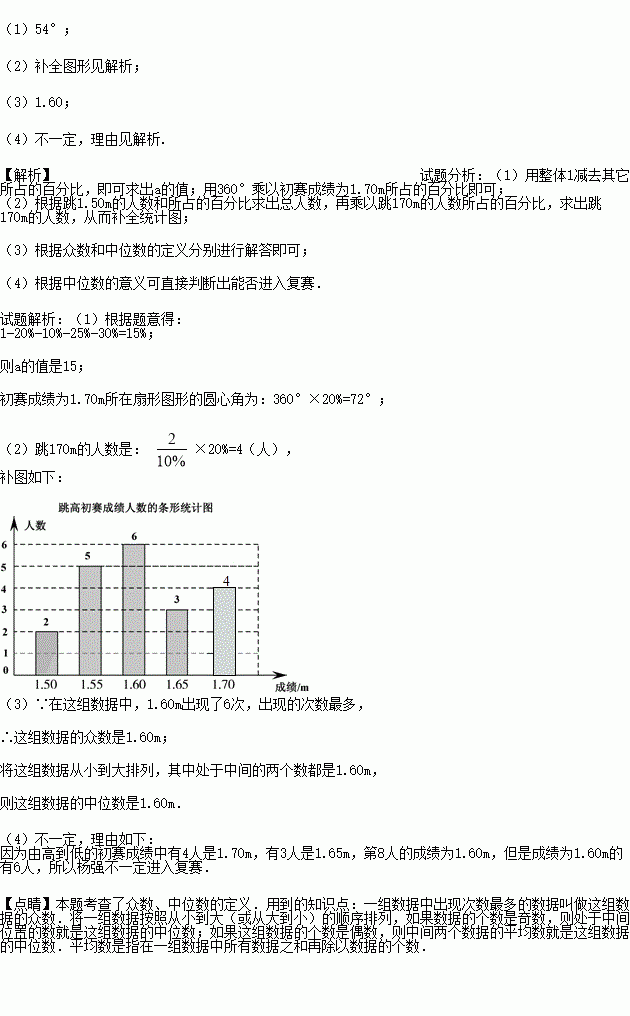 (4)根据这组初赛成绩确定8人进入复赛,那么初赛成绩为1.60m的运动员杨强能否进入复赛?为什么?