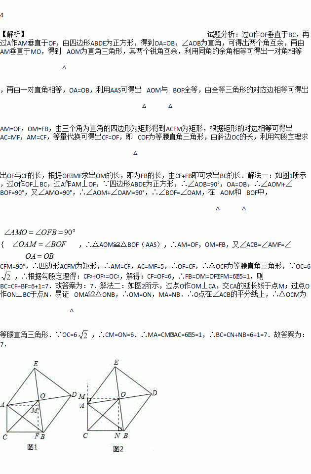 如图,已知Rt△ABC中,∠ACB=90°,以斜边AB为边向外作正方形ABDE,且正方形的对角线交于点O,连结OC.已知AC=5,OC=6