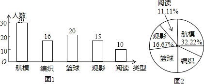 解答 解:(1)∵喜爱篮球、编织小组的人有20+16=36(人),所占百分比为:1-11.11%-16.67%-32.22%=40%,