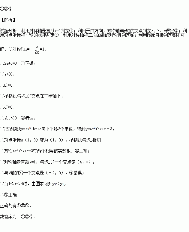 (2015秋•嵊泗县期中)如图是抛物线y1=ax2+bx+c(a≠0)图象的一部分,抛物线的顶点坐标A(1,3),与x轴的一个交点B(4,0),直线y2=mx+n(m≠0)与抛物线交于A,B两点,下列结论: