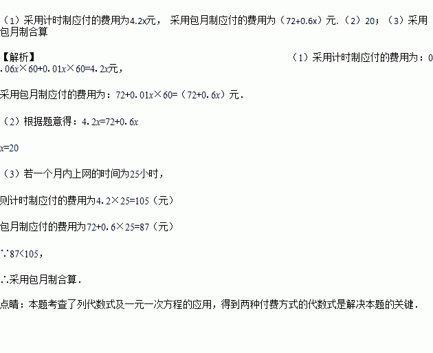 (3)若小明估计自家一个月内上网的时间为25小时,你认为他家采用哪种方式较为合算?