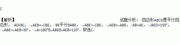 如图,在平行四边形ABCD中,∠ABC的平分线交AD于E,∠BED=150°,则∠A的大小为( )