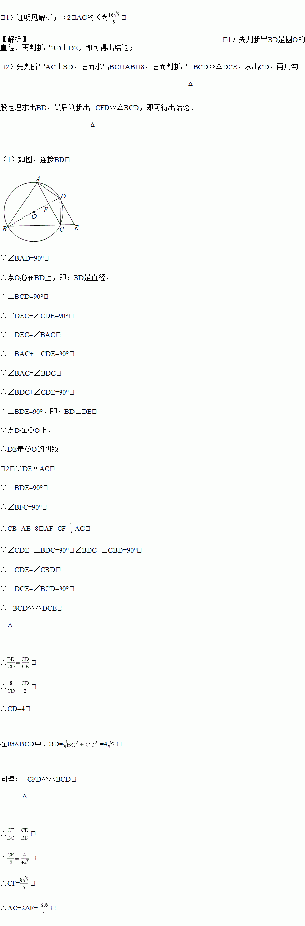 (2)若AC∥DE,当AB=8,CE=2时,求AC的长.