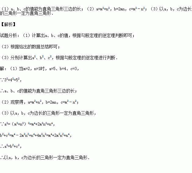 (1)观察表格,当m=2,n=1时,此时对应的a、b、c的值能否为直角三角形三边的长?说明你的理由.