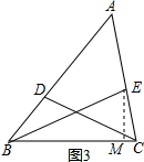 (3)过点E作EM⊥BC于M;根据角平分线的定义得到∠ABC=∠A;由已知条件得到∠EBC=25°,∠A=50°,∠ACB=80°;根据勾股定理得到EM的长度;解直角三角形即可得到BE的长度.