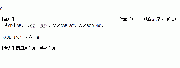 如图,线段AB是⊙O的直径,弦CD丄AB,∠CAB=20°,则∠AOD等于( )