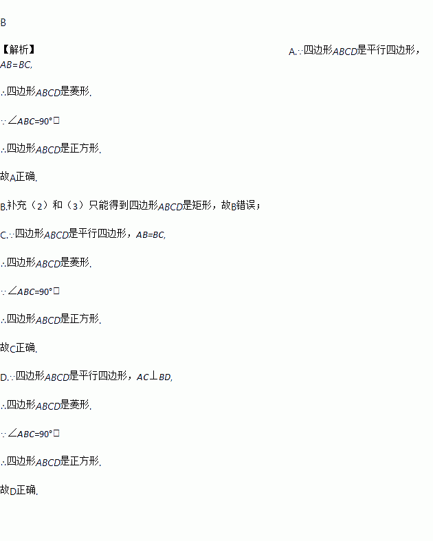 小明在学习了正方形之后,给同桌小文出了道题,从下列四个条件:(1)AB=BC(2)∠ABC=90°(3)AC=BD(4)AC⊥BD 中选两个作为补充条件,使□ABCD为正方形.现有下列四种选法,你认为其中错误的是______.