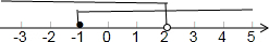 解答 解:(Ⅰ)解不等式①,得x≥-1;(Ⅱ)解不等式②,得x<2;(Ⅲ)如图,(Ⅳ)原不等式的解集为-1≤x<2.故答案为x≥-1,x<2,-1≤x<2.