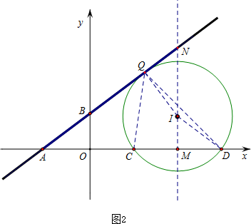 当直线AB与⊙I相切(切点在第一象限)时,直线AB上存在唯一一个符合条件的点Q(切点),使得sin∠CQD=$\frac{4}{5}$(∠CQD=∠MID),此时设CD的垂直平分线交直线AB于点N,