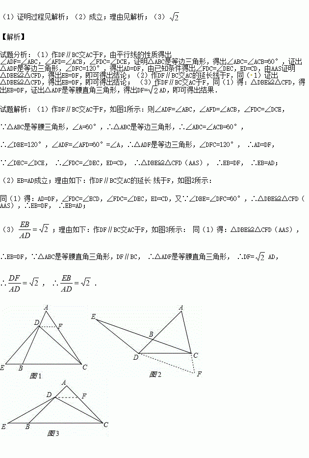 (1)已知:△ABC是等腰三角形,其底边是BC,点D在线段AB上,E是直线BC上一点,且∠DEC=∠DCE,若∠A=60°(如图①).求证:EB=AD;