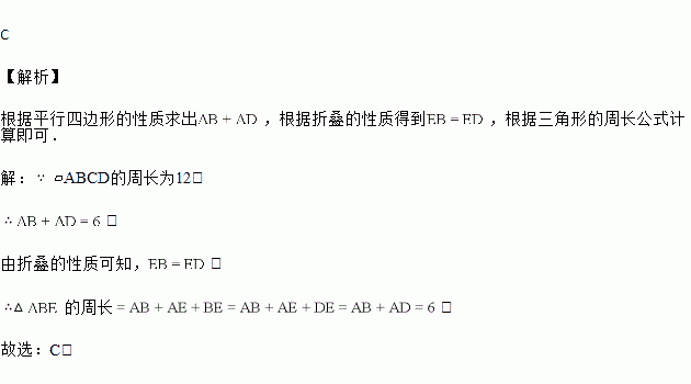 折叠,使点D与点B重合,若?ABCD的周长为12,则![]()