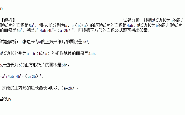 有3张边长为a的正方形纸片,4张边长分别为a、b(b>a)的长方形纸片,5张边长为b的正方形纸片,从其中取出若干张纸片,每种纸片至少取一张,把取出的这些纸片拼成一个正方形(按原纸张进行无空隙、无重叠拼接),则拼成的正方形的边长最长可以为( )
