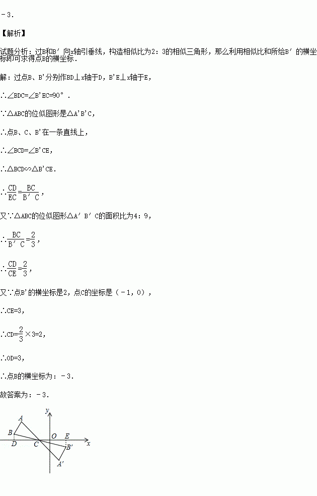 (2015秋•吉安期中)如图,△ABC中,A,B两个顶点在x轴的上方,点C的坐标是(﹣1,0),以点C为位似中心,在x轴的下方作△ABC的位似图形△A′B′C的面积比为4:9.设B点的对应点B′的横坐标是2,则点B的横坐标是 .