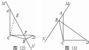 分析:(1)仿照图(1)的解题过程即可解答.过点C作CE⊥CB于点C,与MN交于点E,根据同角(等角)的余角相等可证∠BCD=∠ACE及∠CAE=∠D,由ASA可证△ACE≌△DCB,然后由全等三角形的对应边相等可得:AE=DB,CE=CB,从而确定△ECB为等腰直角三角形,由勾股定理可得:BE=
