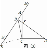 如图(3)过点C作CE⊥CB于点C,与MN交于点E,