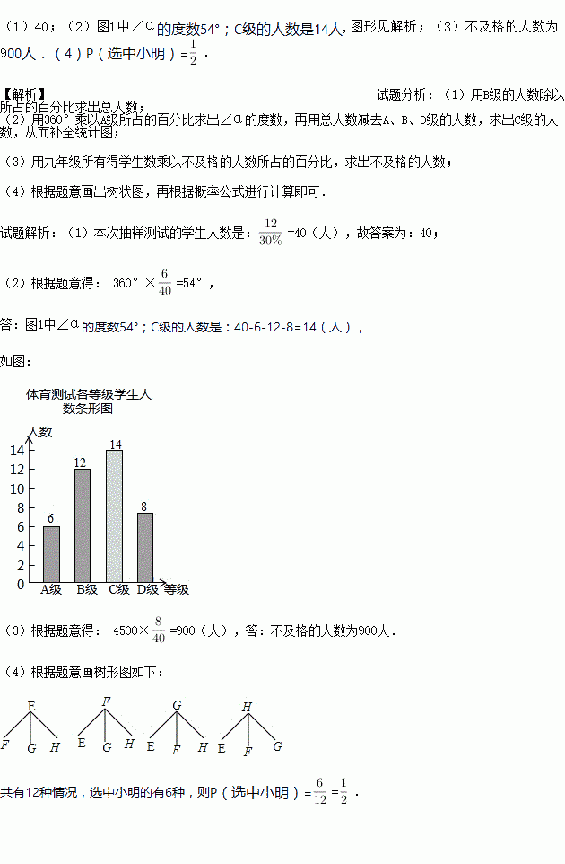 (4)测试老师想从4位同学(分别记为E、F、G、H,其中E为小明)中随机选择两位同学了解平时训练情况,请用列表或画树形图的方法求出选中小明的概率.