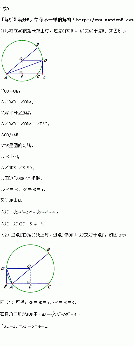 如图,AC是以AB为直径的⊙O的弦,点D是⊙O上的一点,过点D作⊙O的切线交直线AC于点E,AD平分∠BAE,若AB=10,DE=3,则AE的长为_____.