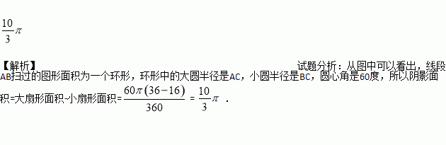 如图,将△ABC绕点C旋转60°得到△A′B′C,已知AC=6,BC=4,则线段AB扫过图形(阴影部分)的面积为___________.(结果保留π)