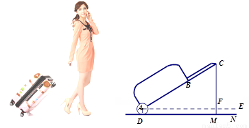拉杆箱指具有拉杆和滚轮的行李箱,因其使用方便成为出门旅行的必备工具。如图,是一种拉杆式旅行箱的示意图,箱体长AB=50cm,拉杆最大伸长距离BC=30cm,(点A、B、C在同一条直线上),在箱体的底端装有一圆形滚轮⊙A,其直径为10cm,⊙A与水平地面切于点D,过A作AE∥DM.当人的手自然下垂拉旅行箱时,人感觉较为舒服,已知某人的手自然下垂在点C处且拉杆达到最大伸长距离时,点C距离水平地面(