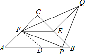 分析 取AB中点D,连接FD,根据等腰直角三角形的性质,由△ABC为等腰直角三角形得到AC=BC,∠A=45°,再根据点D、E、F分别是△ABC三边的中点,则AD=BD=4,DP=3,EF为△ABC的中位线,于是可判断△ADF为等腰直角三角形,得到∠FDA=45°,利用三角形中位线的性质得EF∥AB,EF=$\frac{1}{2}$AB=5,根据平行线性质得∠EFP+∠DFP=45°;又由于△PQF为等腰直角三角形,则∠EFP+∠EFQ=45°,所以∠DFP=∠EFQ,然后根据有两组对应边成比例且夹角相等的三角形相似,得出△FDP∽△FEQ,再根据相似三角形的对应边成比例即可求得.