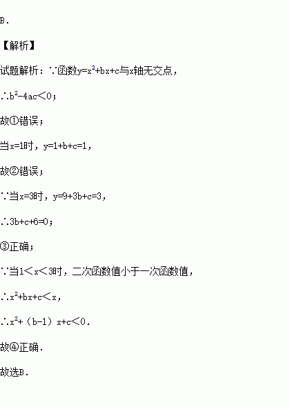 函数y=x2+bx+c与y=x的图象如图所示,有以下结论:①b2-4c>0;②b+c+1=0;③3b+c+6=0;④当1<x<3时,x2+(b-1)x+c<0;其中正确的个数是:( )